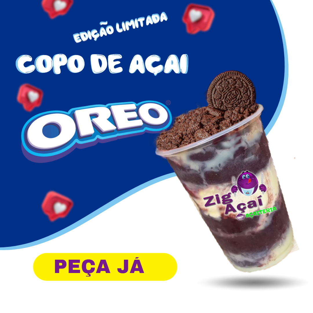 Aprecie o frescor do nosso Copo de Açaí Oreo de 400ml! Feito com açaí cremoso, leite condensado, leite Ninho e bolacha Oreo triturada. Uma combinação de sabores que vai encantar seu paladar. Refresque-se e desfrute dessa delícia!