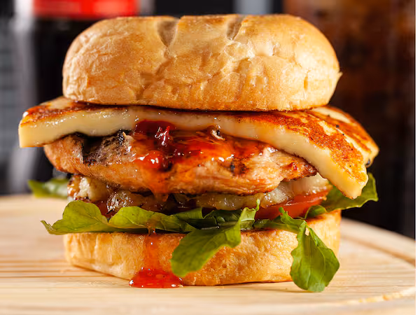 Pao frances, rucula, tomate, burger de frango 180g, queijo coalho, melaço de cana ou geleia de pimenta (especificar na obs)