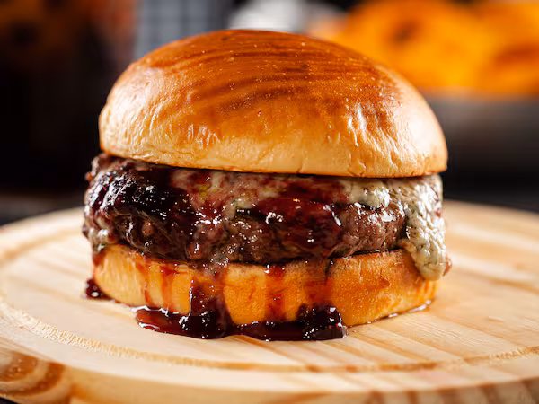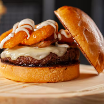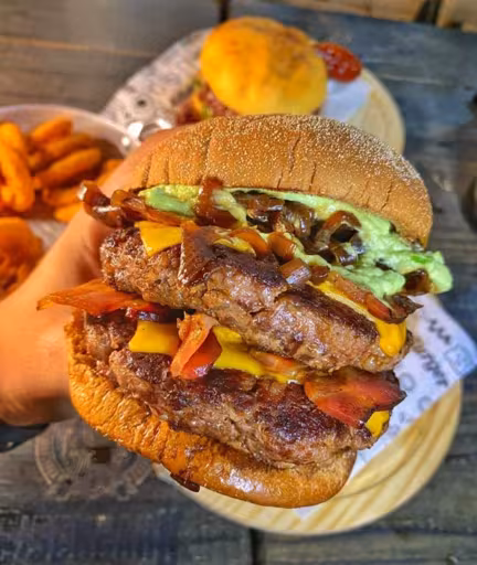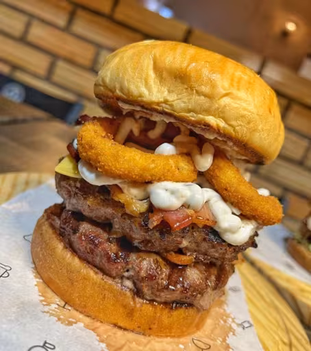 pao brioche, molho bbq, 2x burger 180g, 2x bacon, 2 muçarela, aneis de cebola e molho da casa