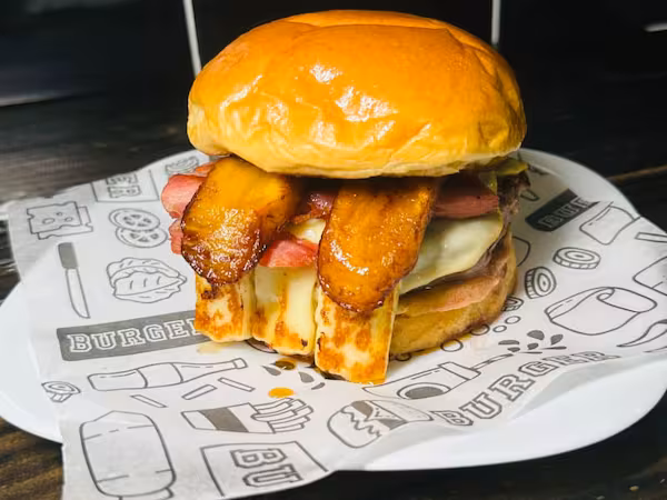 PAO AUSTRALIANO, MOLHO DE ERVAS, 2X BURGER 180G, 2X CHEDDAR, 2X BACON, CEBOLA CARAMELIZADA E MOLHO DA CASA