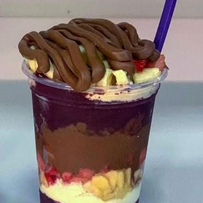 Açai, banana, morango, leite condensado, creme de avelã e granola