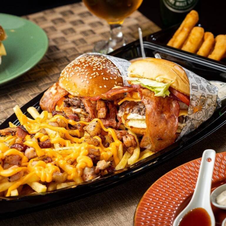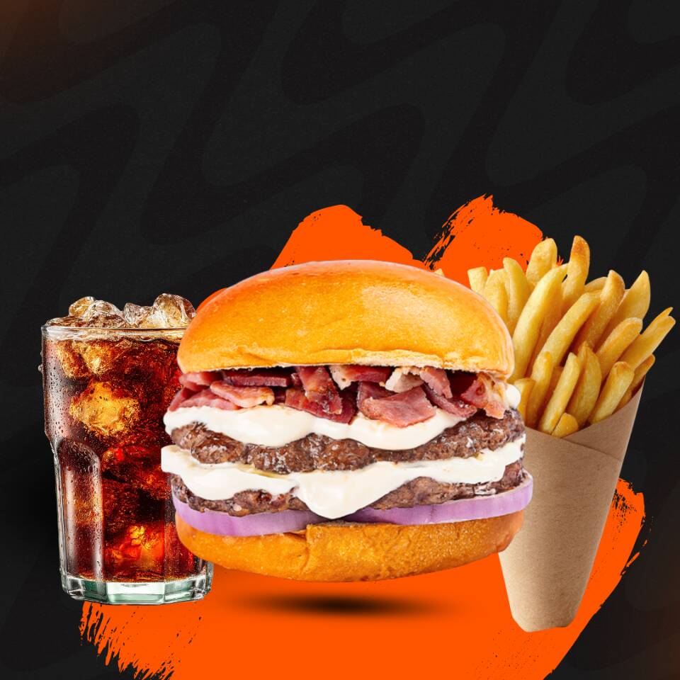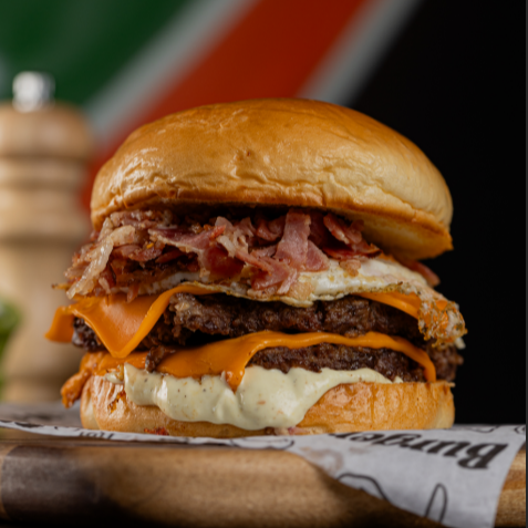 Pão, 2 Smash bovinos de 70g, cheddar, bacon, ovo e molho da casa.