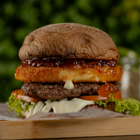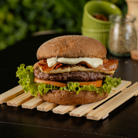 Pão, Hamburguer suino de 150g ou Hamburguer de Costela bovina de 150g, bacon coalho, mel, alface, tomate e molho da casa.