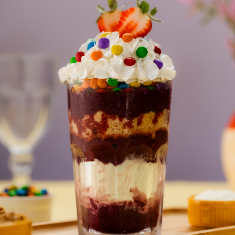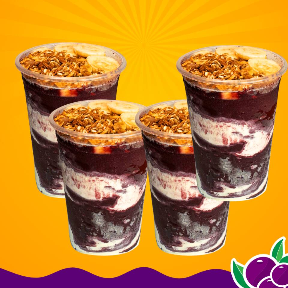 São 4 copos em camadas de 500ml cada um, ambos com 4 adicionais inclusos: são Banana, Granola, Leite Condensado e Paçoca.
