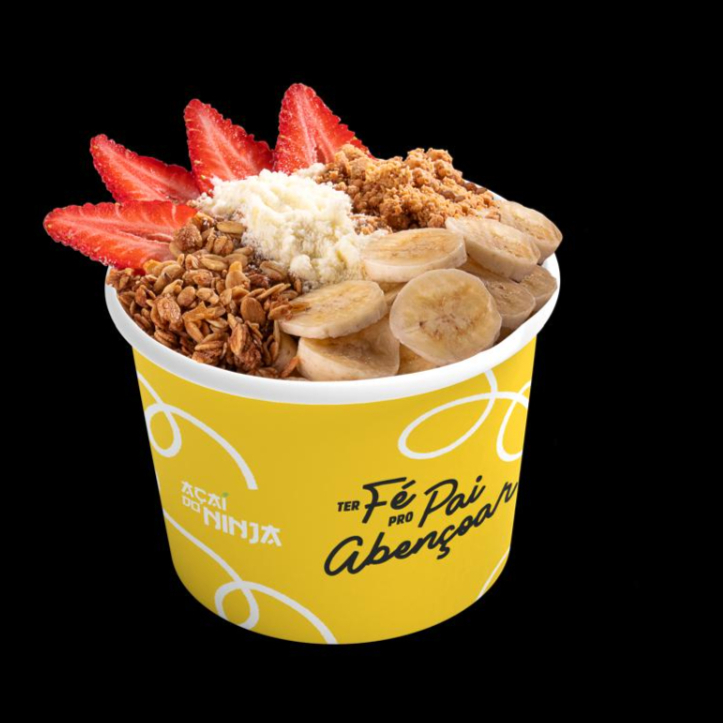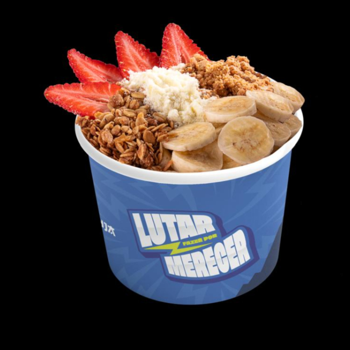 Sua Tigela ja vem completa com os adicionais: Banana, Granola, Morango, Leite em po, peite condensado e Paçoca.
