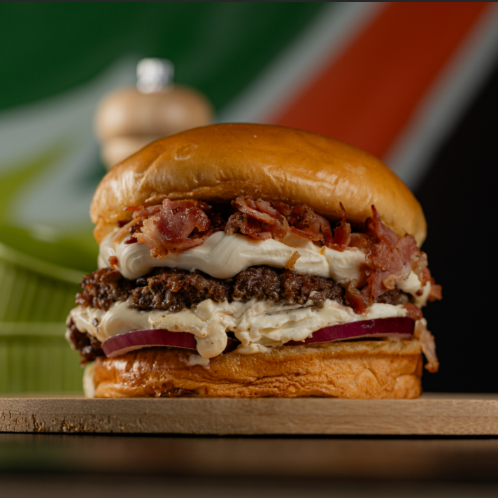 Pão, 2 Smash bovinos de 70g, bacon, cream cheese e cebola.