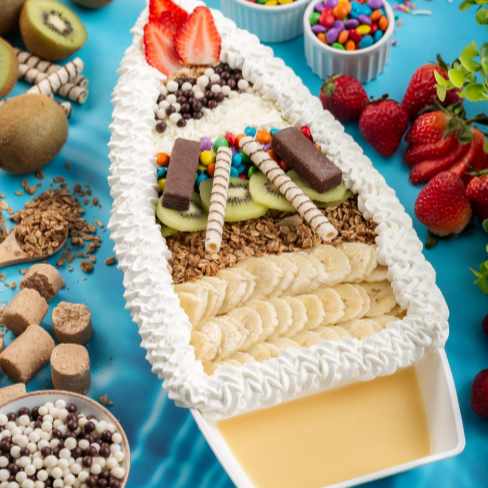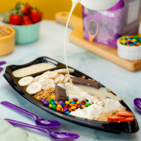 Pensa num trem bão? São 12 acompanhamentos para fazer seu dia ficar ainda mais completo. Banana, granola, confete, leite em pó, chocopower, paçoca, morango, bis, palitinho de chocolate e leite condensado.
