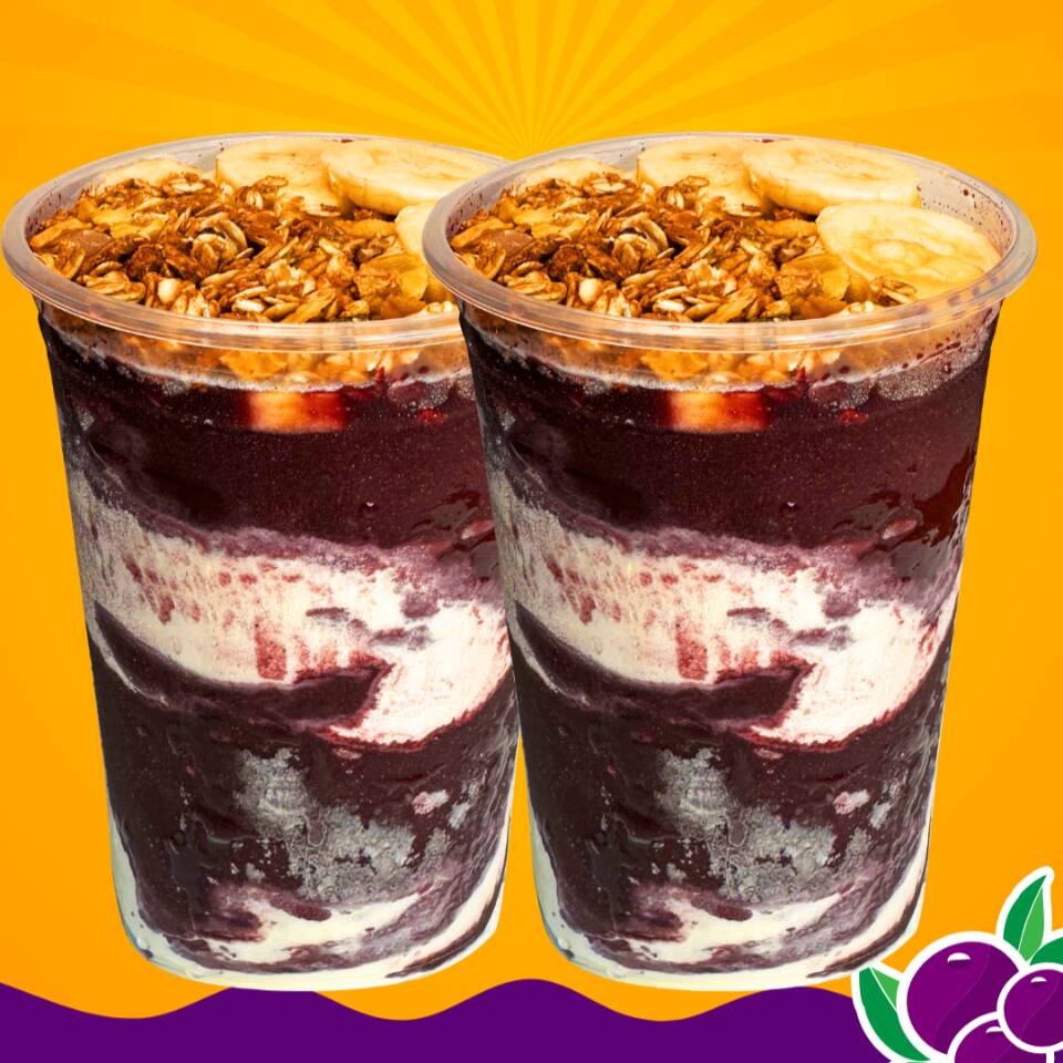 São 2 copos em camadas de 500ml cada um, ambos com 4 adicionais inclusos: são Banana, Granola, Leite Condensado e Paçoca.