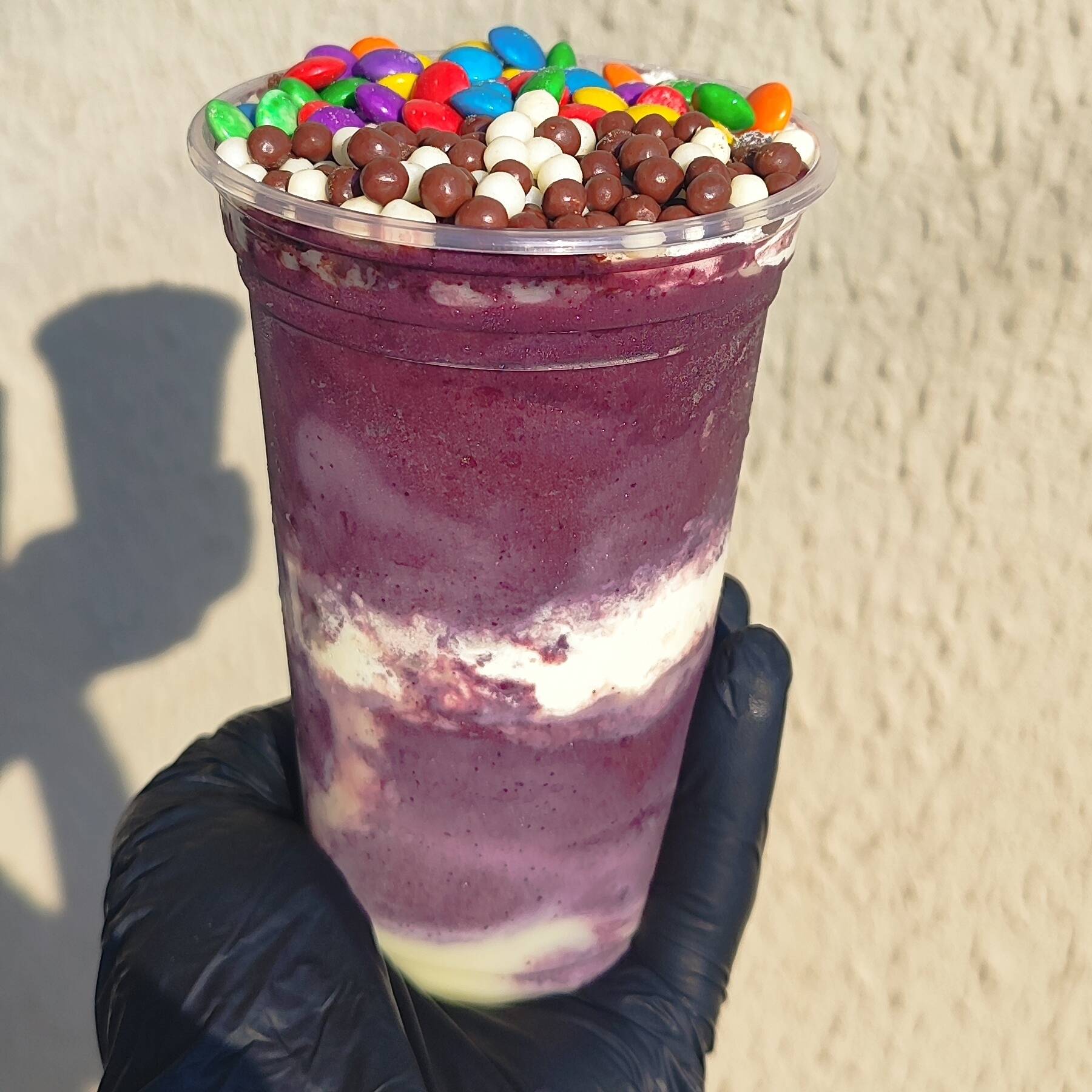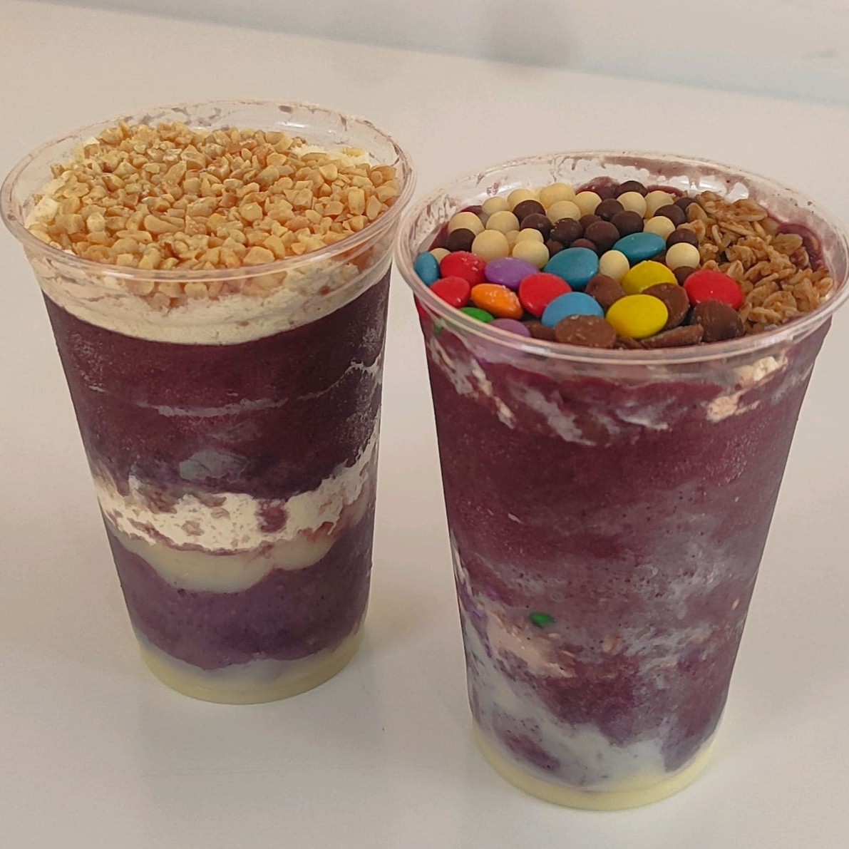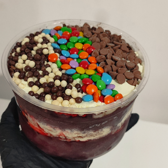Ingredientes: Amendoim, choco ball, disquete, gotas de chocolate, granola, leite em pó, ovomaltine, paçoca, leite condensado, calda de chocolate e calda de morango.