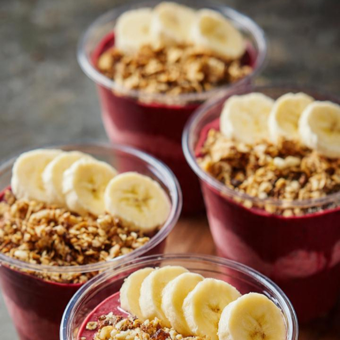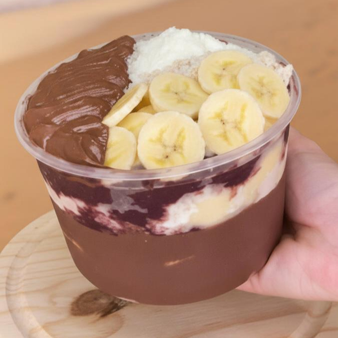 Açaí cremoso servido com até 7 acompanhamentos à sua escolha.