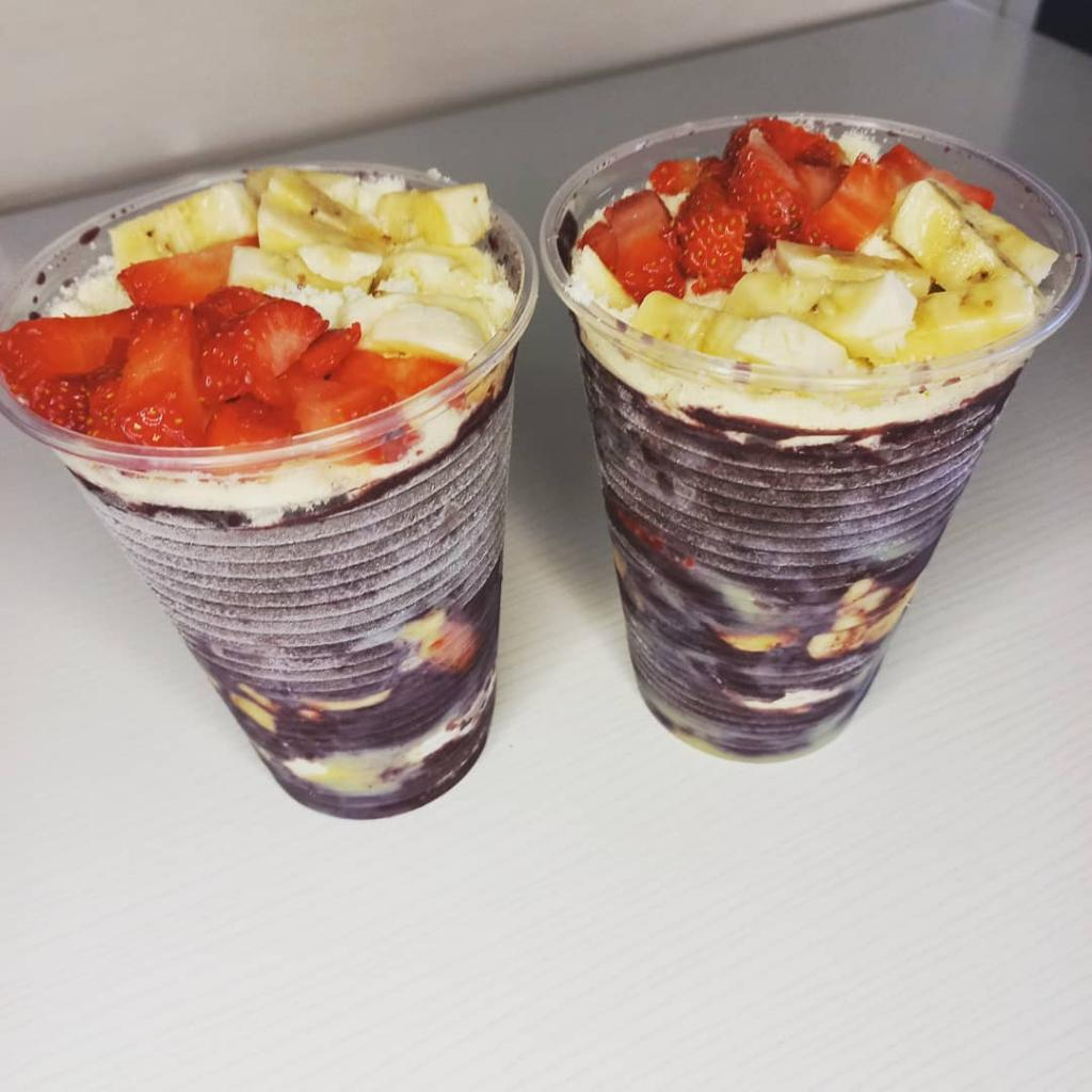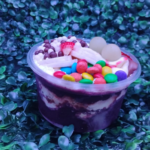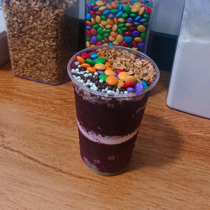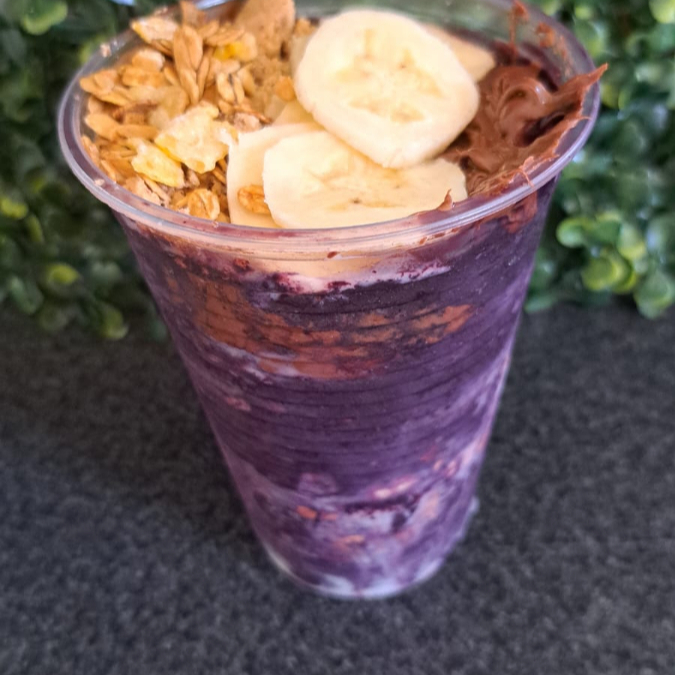 Delicioso açaí em camadas, preparado com ingredientes exclusivos para uma experiência refrescante e saborosa entre amigos.