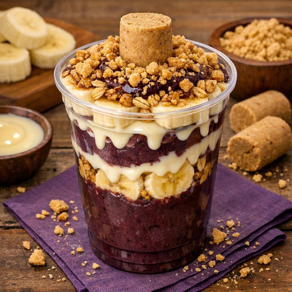 02 Copos de Açaí 300 ml + 4 adicionais grátis ( Banana, granola, Leite condensado e Paçoca) - imagem ilustrativa