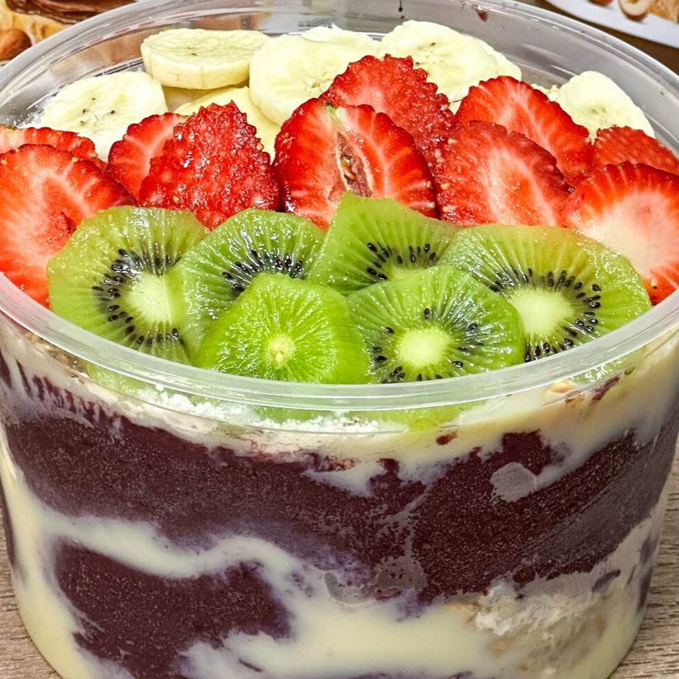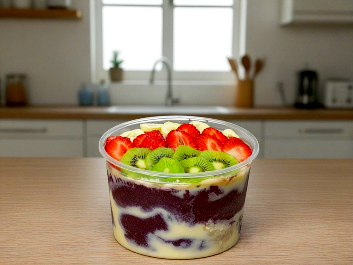Este item acompanha duas camadas dos seguintes complementos: Açaí, morango, banana, granola, paçoca, amendoim, leite em pó e leite condensado