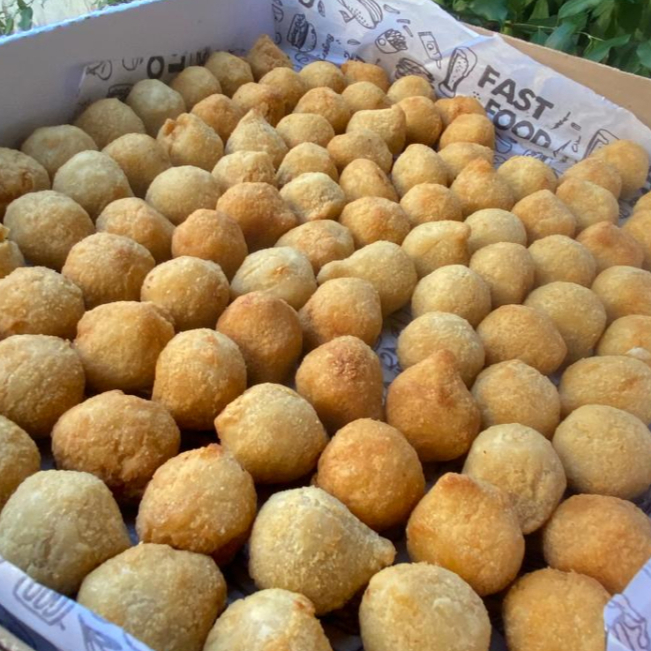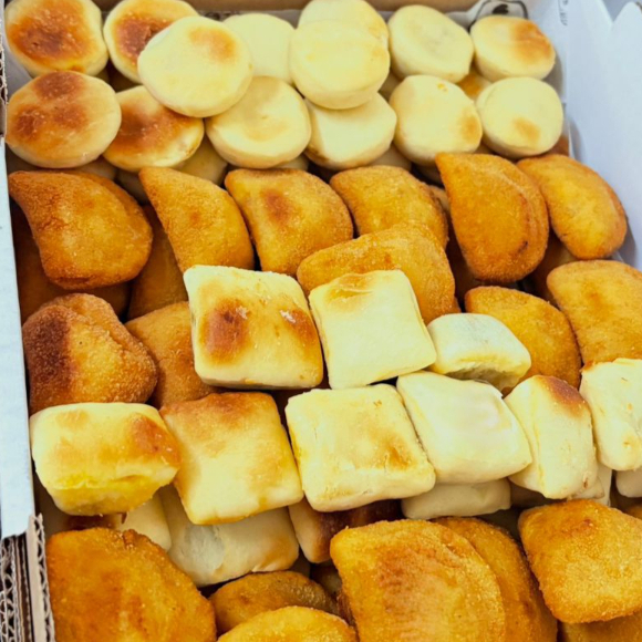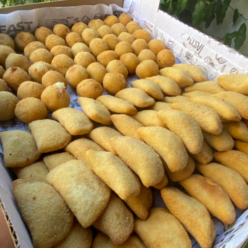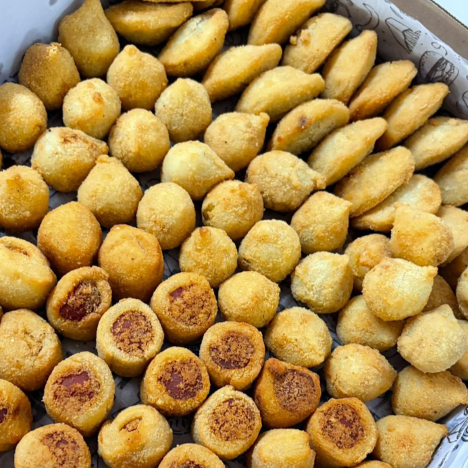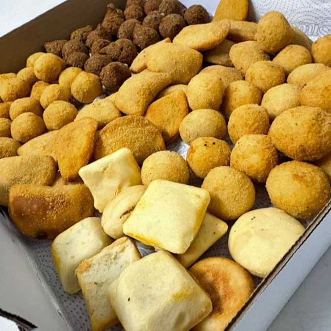 Salgados artesanais, crocantes por fora e cremosos por dentro, preparados com ingredientes de qualidade.