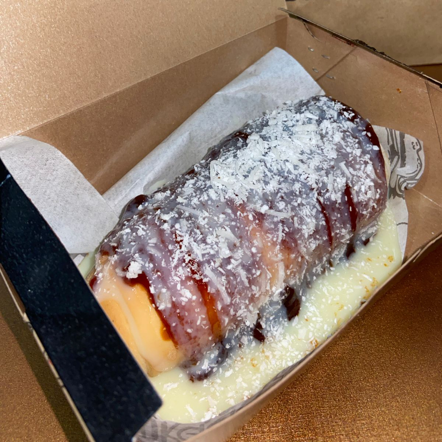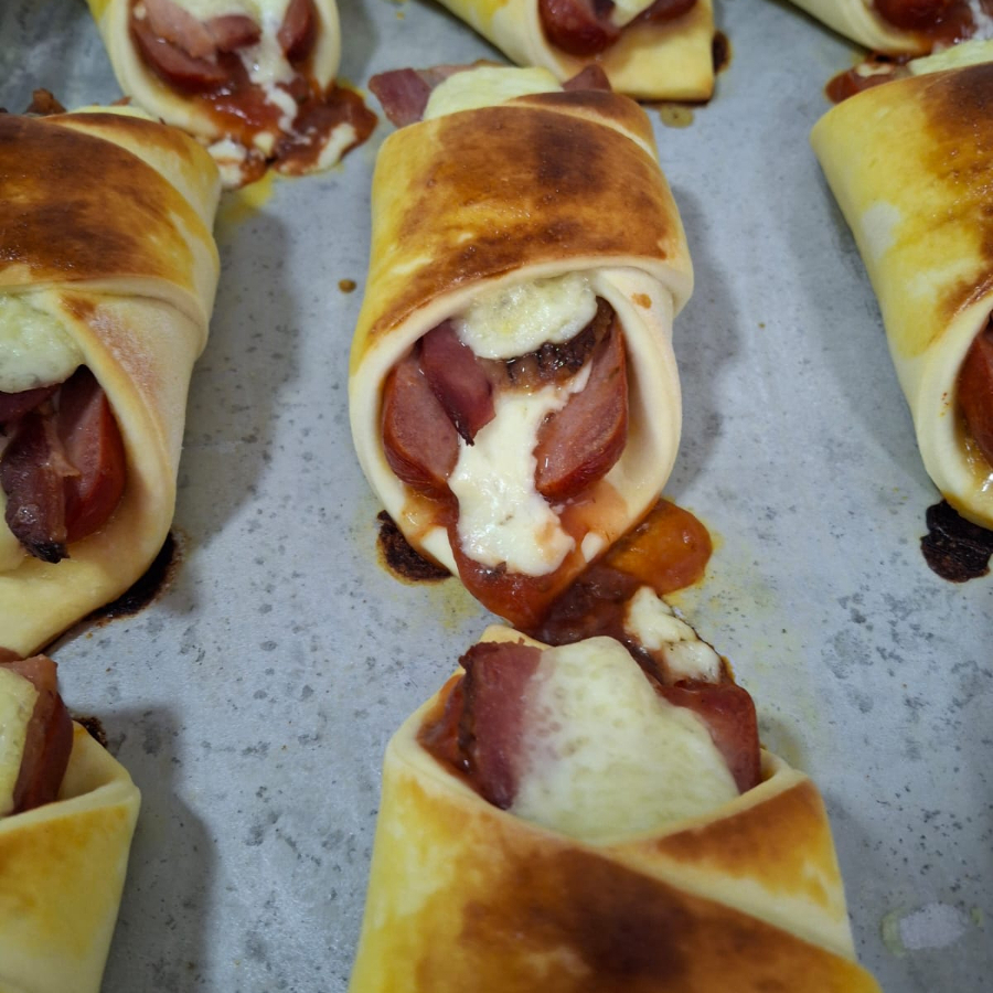 Salgado assado recheado com salsicha, bacon e muçarela.
