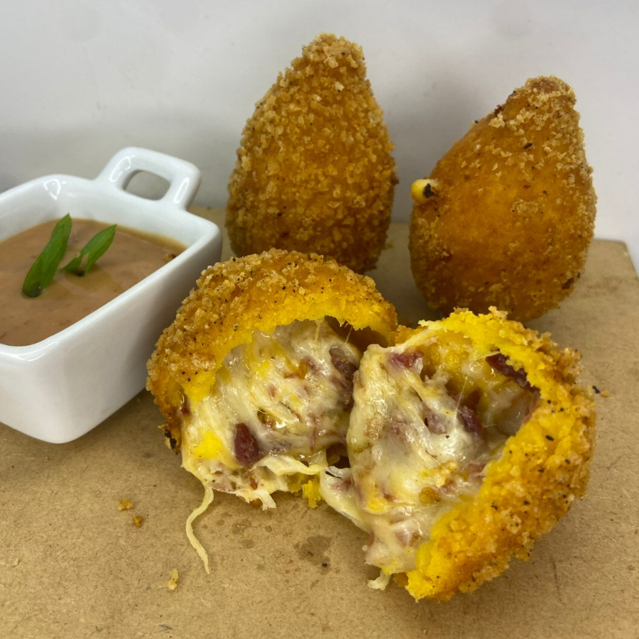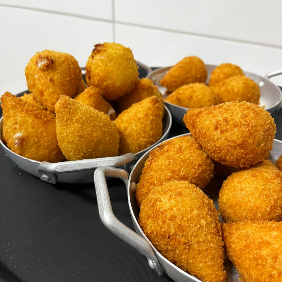 Coxinha feita com farinha de trigo, óleo de soja, leite, caldo de galinha, margarina, jiló, espinafre, tomate, cebola, cebolinha requeijão e farinha panko.