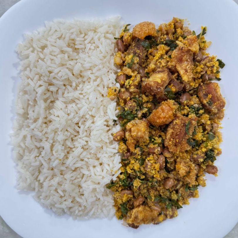 Arroz branco feito na hora com feijão tropeiro feito com panceta e toucinho crocante