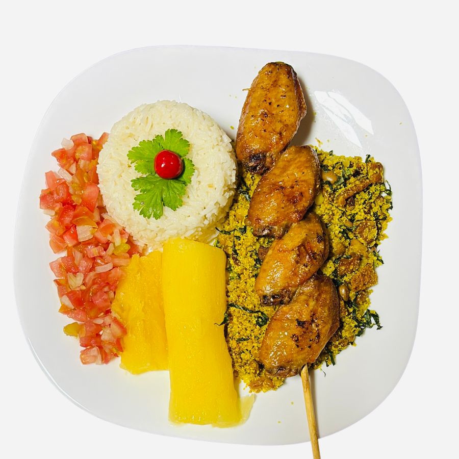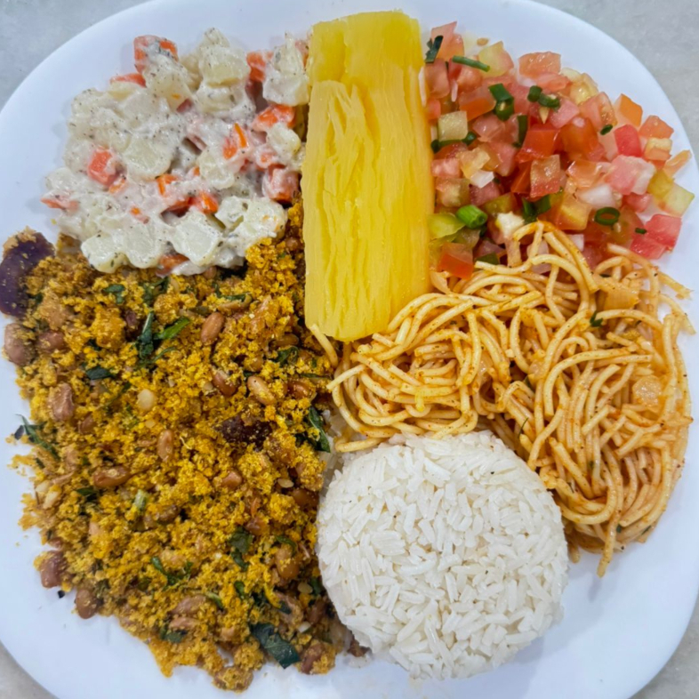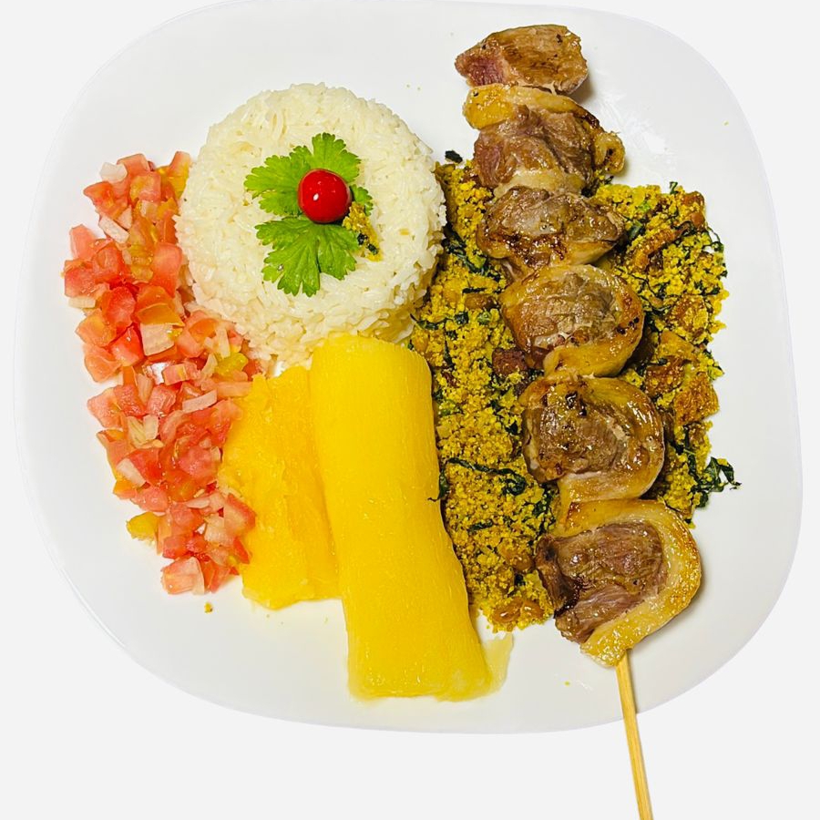 Já vai com um espetinho da sua escolha assado na brasa no ponto certo, leve e saboroso, ideal pra quem gosta de algo mais suave. Acompanha uma porção generosa de arroz, feijão tropeiro que é uma verdadeira explosão de sabores, mandioca cuidadosamente cozida até atingir a textura perfeita, salada de maionese, macarrão e um vinagrete refrescante, realçado pelo sabor ácido e equilibrado. Vai em embalagem selada. um refri 600ml de brinde