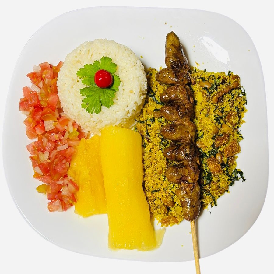 Espetinho de coração grelhado no ponto certo, macio por dentro e levemente tostado por fora. Acompanha uma porção generosa de arroz, feijão tropeiro que é uma verdadeira explosão de sabores, mandioca cuidadosamente cozida até atingir a textura perfeita e um vinagrete refrescante, realçado pelo sabor ácido e equilibrado. Vai em embalagem selada.