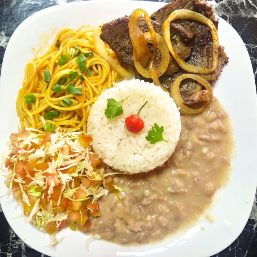 Bife acebolado, grelhada no ponto certo para um sabor nobre e marcante. Acompanha uma porção generosa de arroz, feijão de caldo que é uma verdadeira explosão de sabor, macarrão ou mandioca cuidadosamente cozida até atingir a textura perfeita e um vinagrete refrescante, realçado pelo sabor ácido e equilibrado. Vai em embalagem selada.