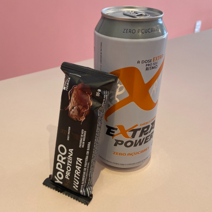 Barra YoPRO 15g de proteína sabor chocolate + Energy Drink Extra Power Zero Açúcares. A combinação perfeita para dar energia e ajudar na recuperação com proteína, ideal para quem busca disposição no dia a dia.