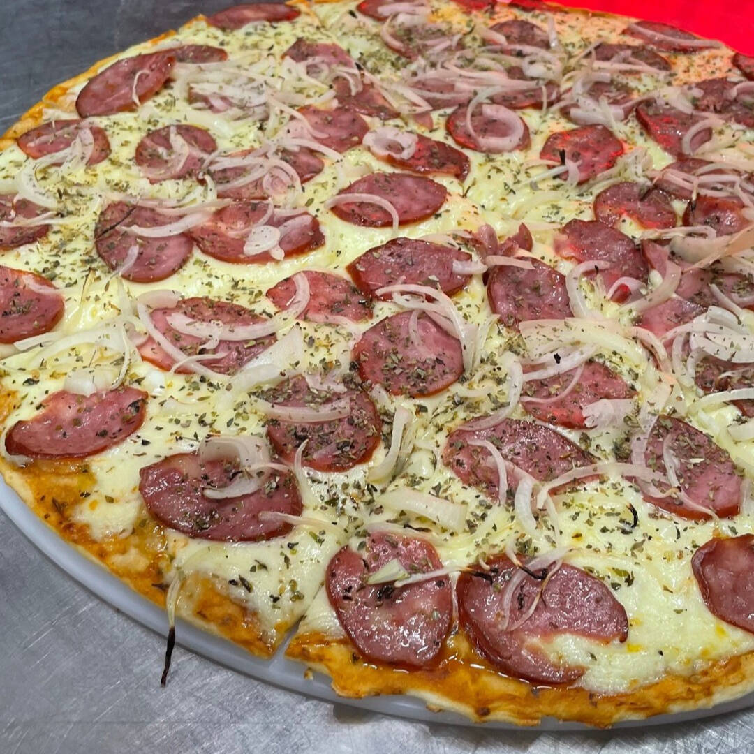 Molho, mussarela, calabresa, cebola, orégano e azeitona.