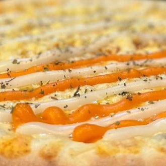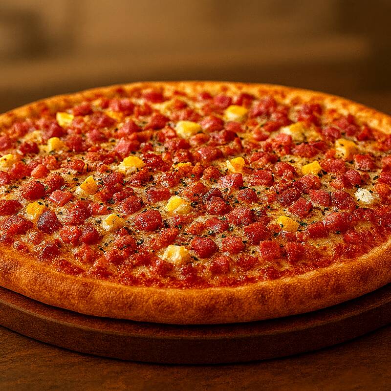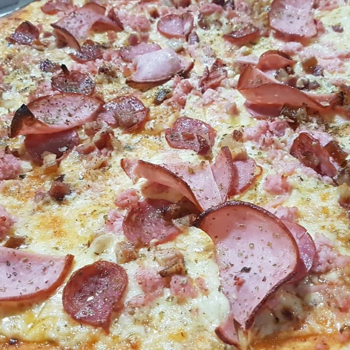 Molho, mussarela, lombinho, salaminho, bacon, cebola, orégano.