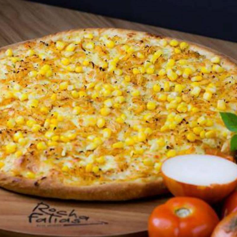 Molho, mussarela, frango, milho, cebola, orégano e azeitona.