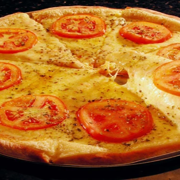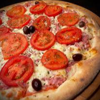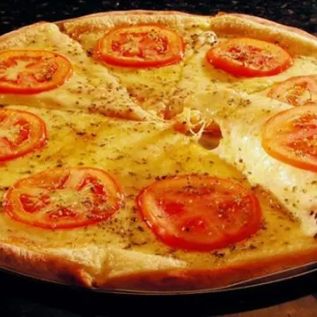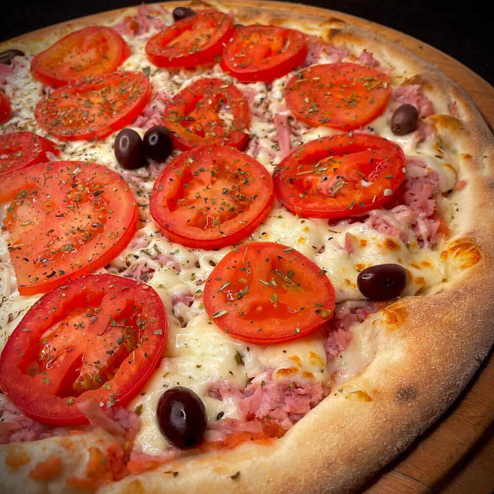 Molho, mussarela, presunto, tomate, orégano e azeitona.