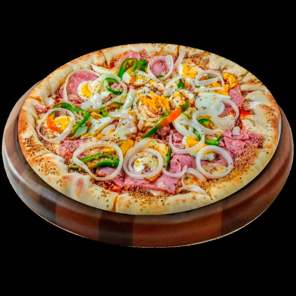 Molho, mussarela, presunto, ovo, bacon, orégano e azeitona.