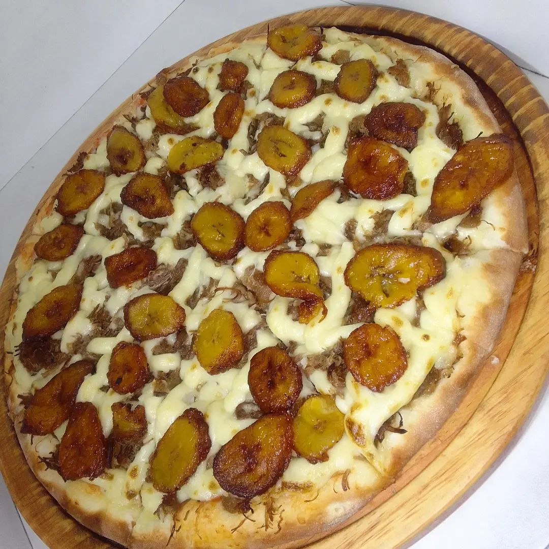 Molho, mussarela, carne seca, banana frita, catupiry, orégano e azeitona.