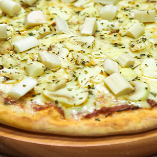 Molho, mussarela, palmito, cebola, orégano e azeitona
