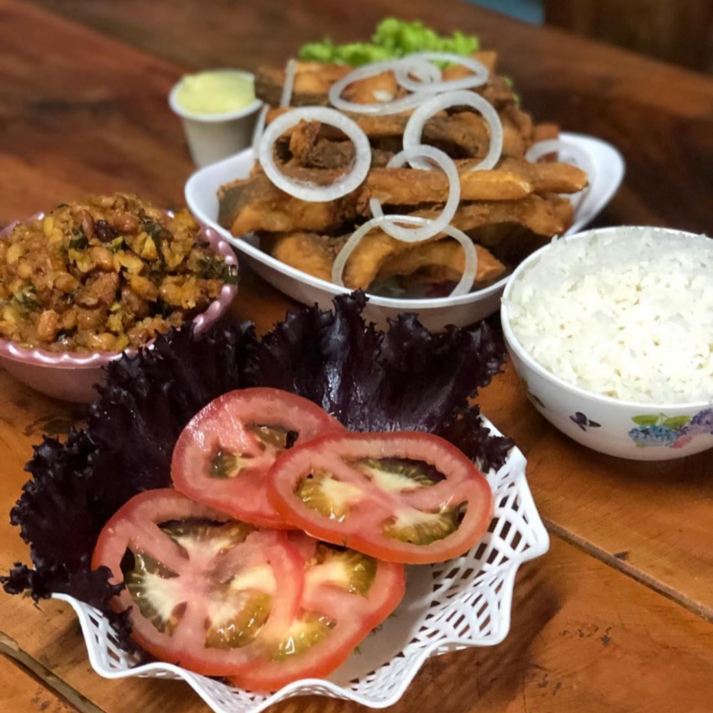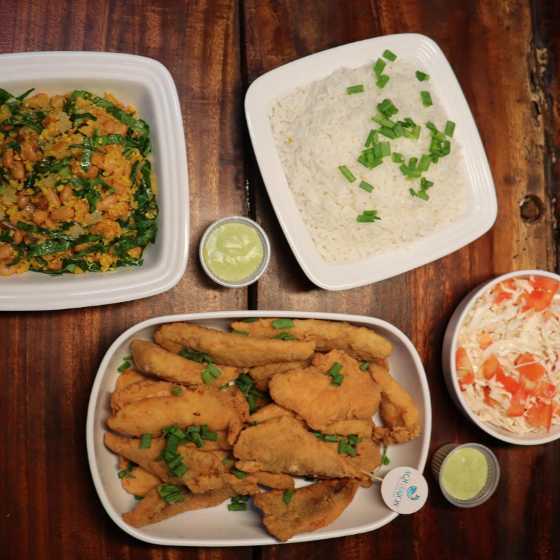 Filé de Tilápia, arroz, feijão tropeiro e salada. O seu jantar saboroso está pronto. Peça agora!