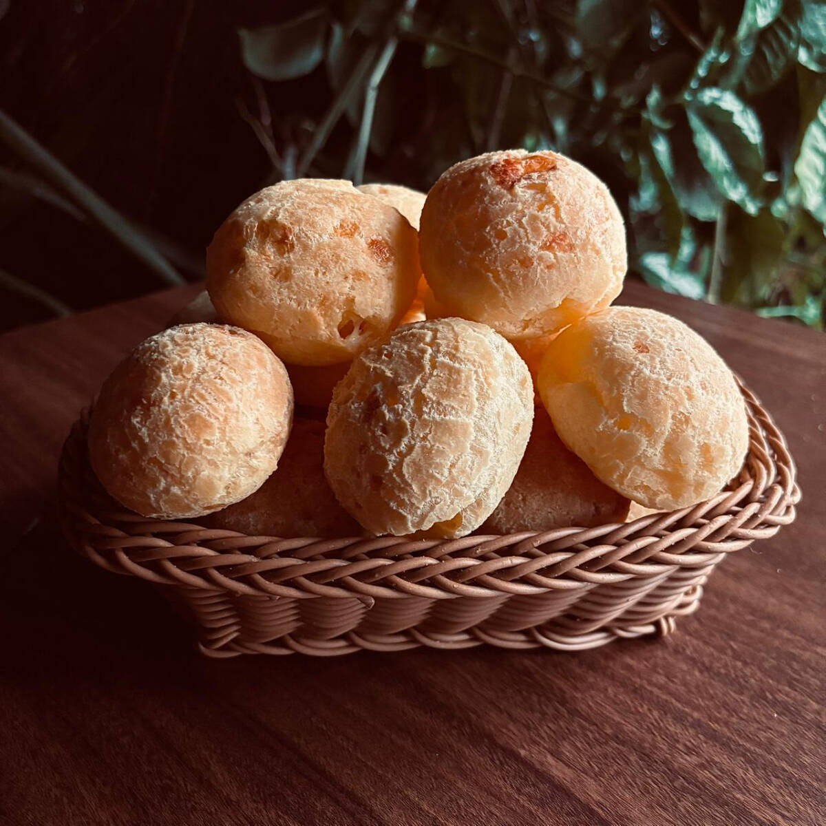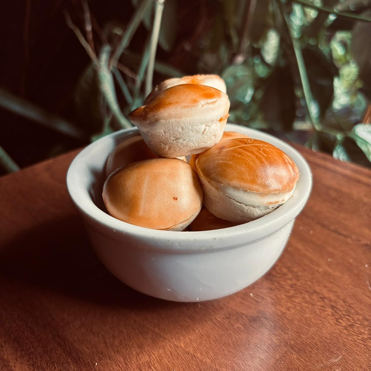 Pão de queijo quentinho, com casquinha levemente crocante e interior macio e elástico.