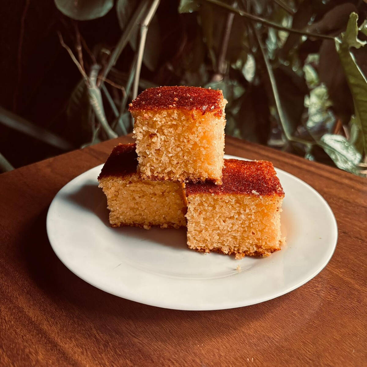 Bolo de milho caseiro, macio e bem úmido, com sabor intenso de milho e toque levemente adocicado