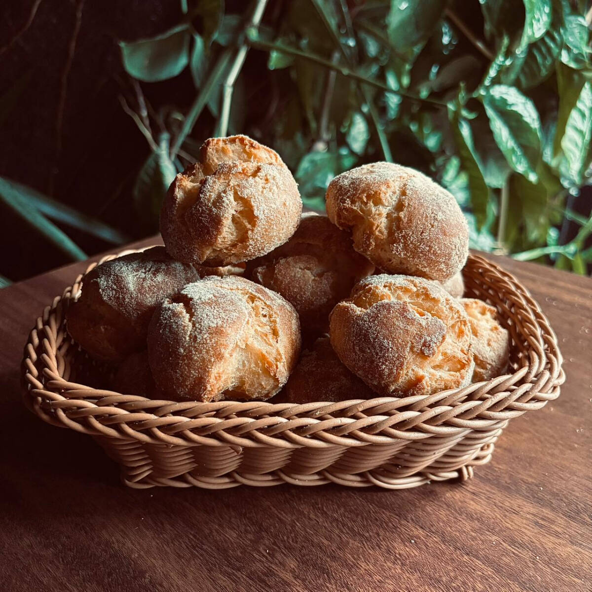 Mané pelado caseiro, macio e bem úmido, feito com mandioca e queijo, trazendo um sabor marcante e levemente adocicado. Uma