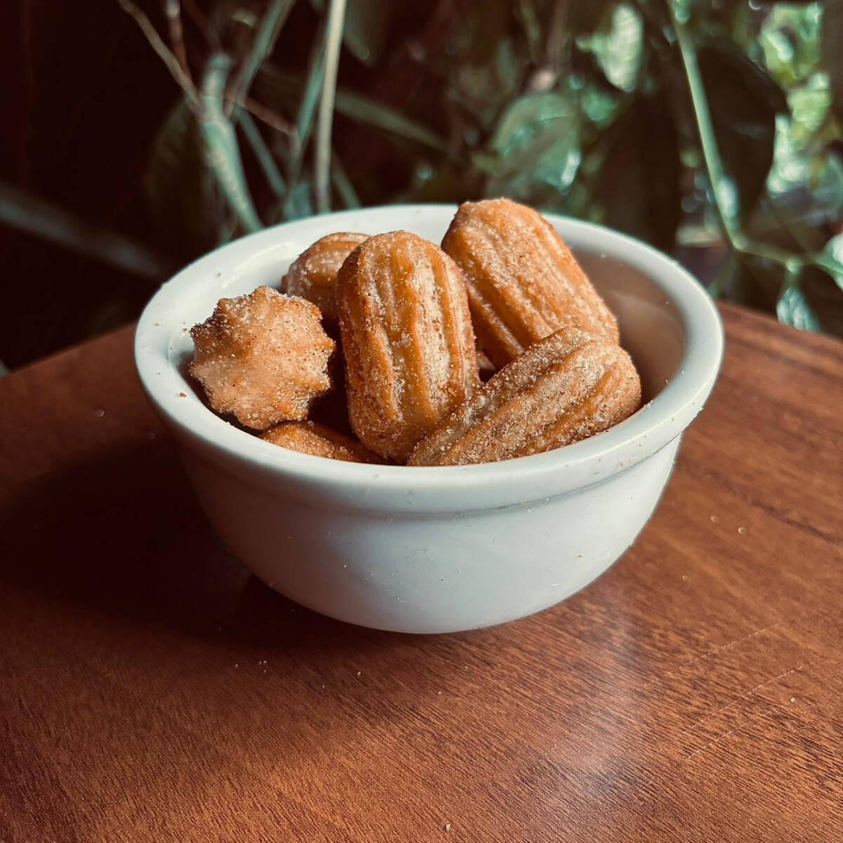 Pequenos churros sequinhos e crocantes, polvilhados com açúcar e canela.