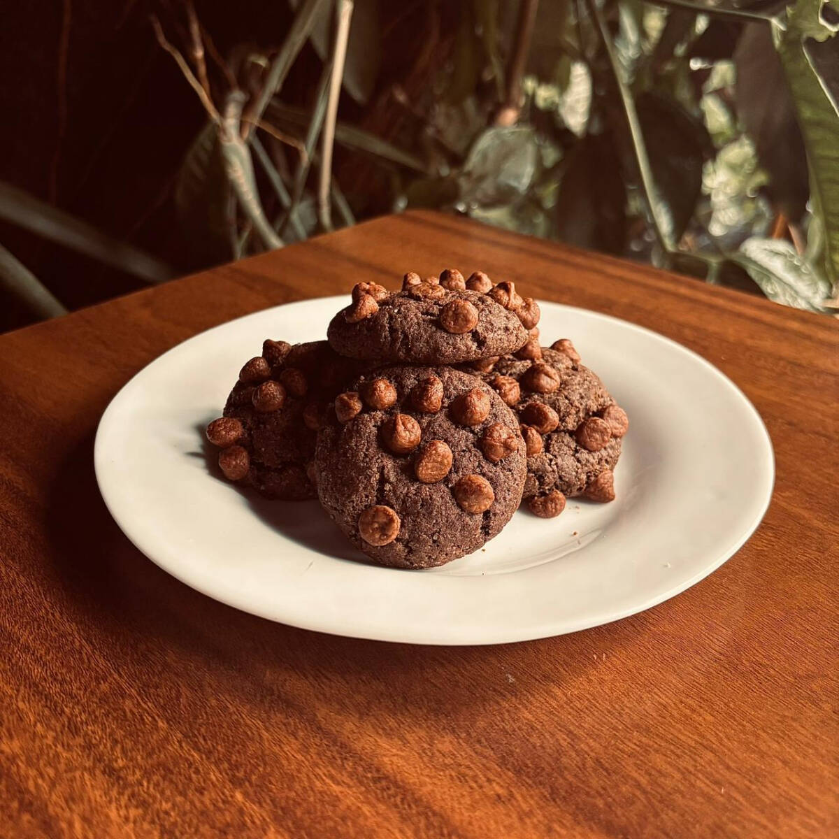 Cookie de massa de chocolate, macio por dentro e levemente crocante por fora, com gotas de chocolate que derretem a cada mordida.