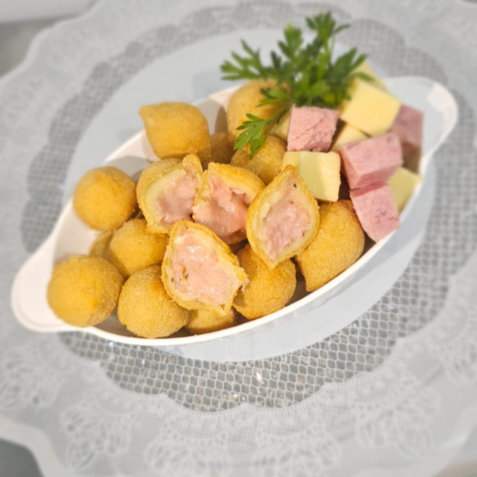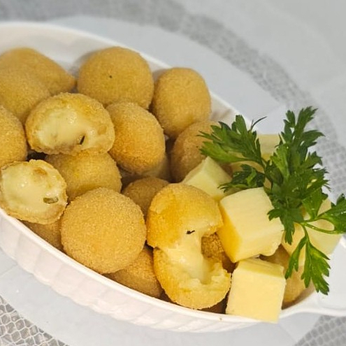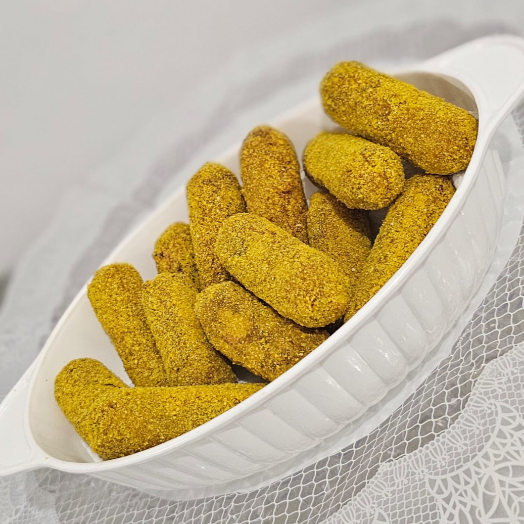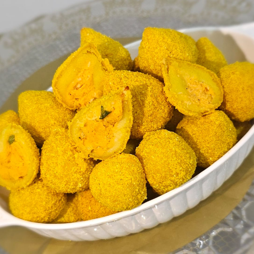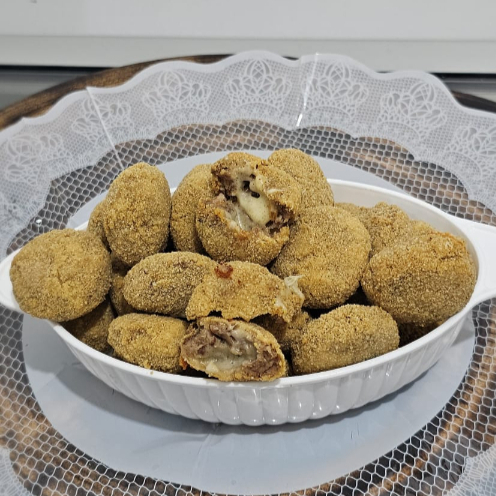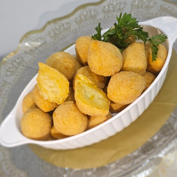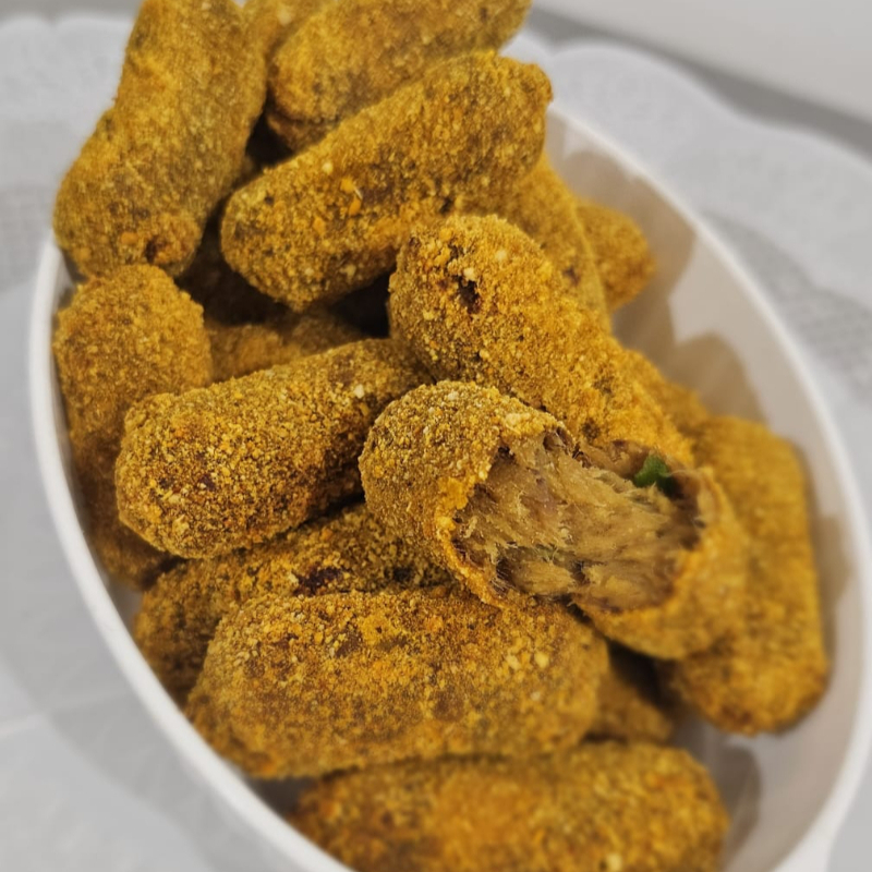 Croquetes deciliosos, preparado com farinha especifica para salgados e temperos.