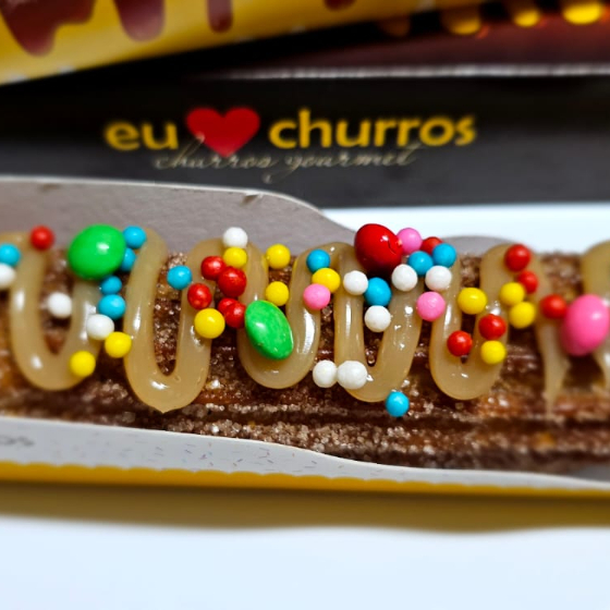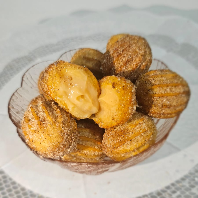 mini churros com recheio de doce de leite e empanado com canela e açucar.