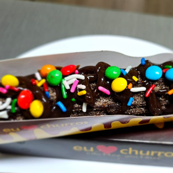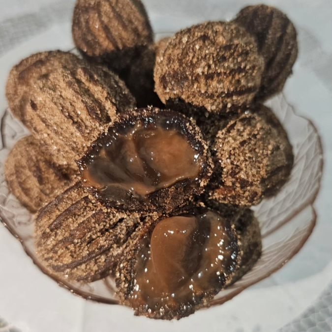 mini churros com recheio de doce de chocolate e empanado com canela, chocolate em pó e açucar.