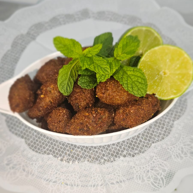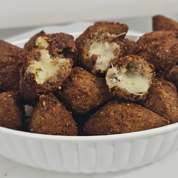 Quibe preparado com trigo, creme de cebola, carne,hortelã, recheado com queijo mussarela.