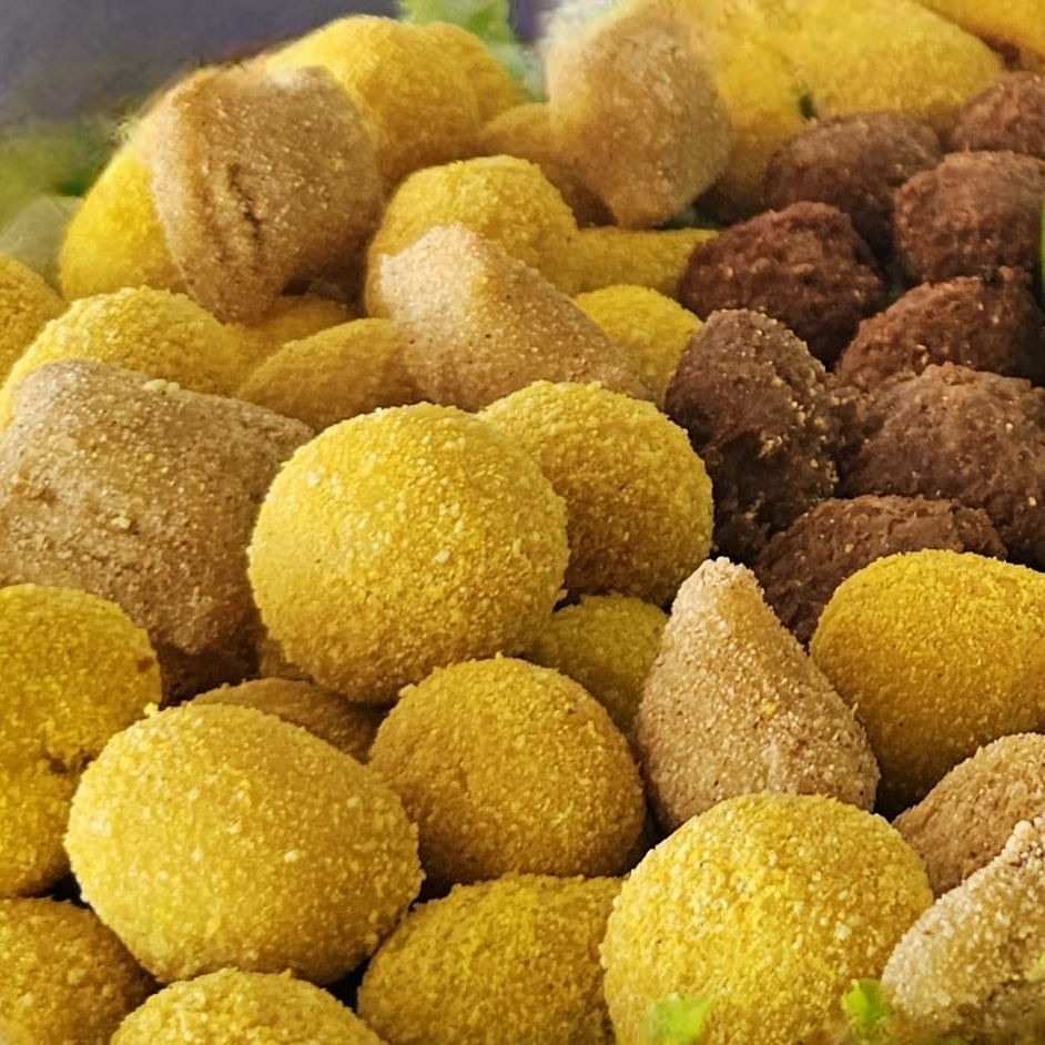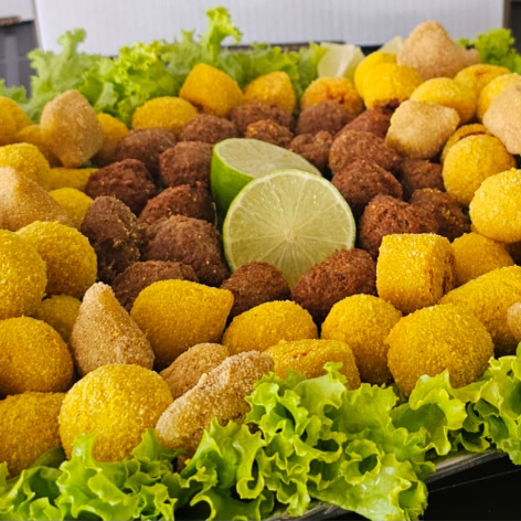 coxinha de frango, travesseiro de carne, kibe tradicional, enroladinho salsicha, risole de milho, bolinha de queijo, Balaozinho napolitano, croquete de carne, croquete de frango, croquete de tilápia, croquete de costela e balaozinho de calabresa.