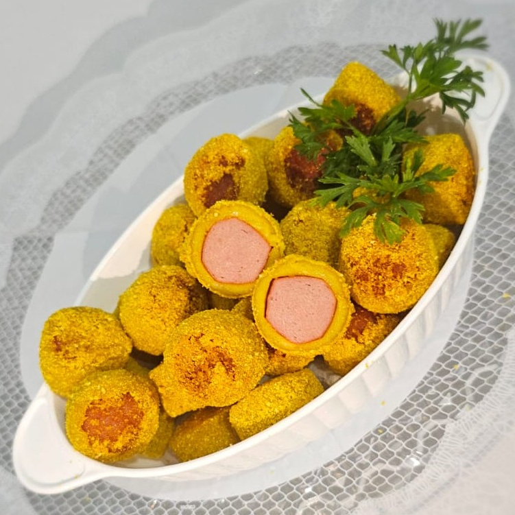Preparado com farinha de trigo específica para salgados, recheado com milho natural e creme de milho.