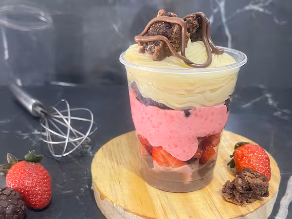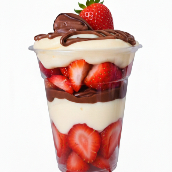 Copo de 300ml composto por morangos frescos, Brownie, brigadeiro tradicional, trufado de Ninho e mousse de morango