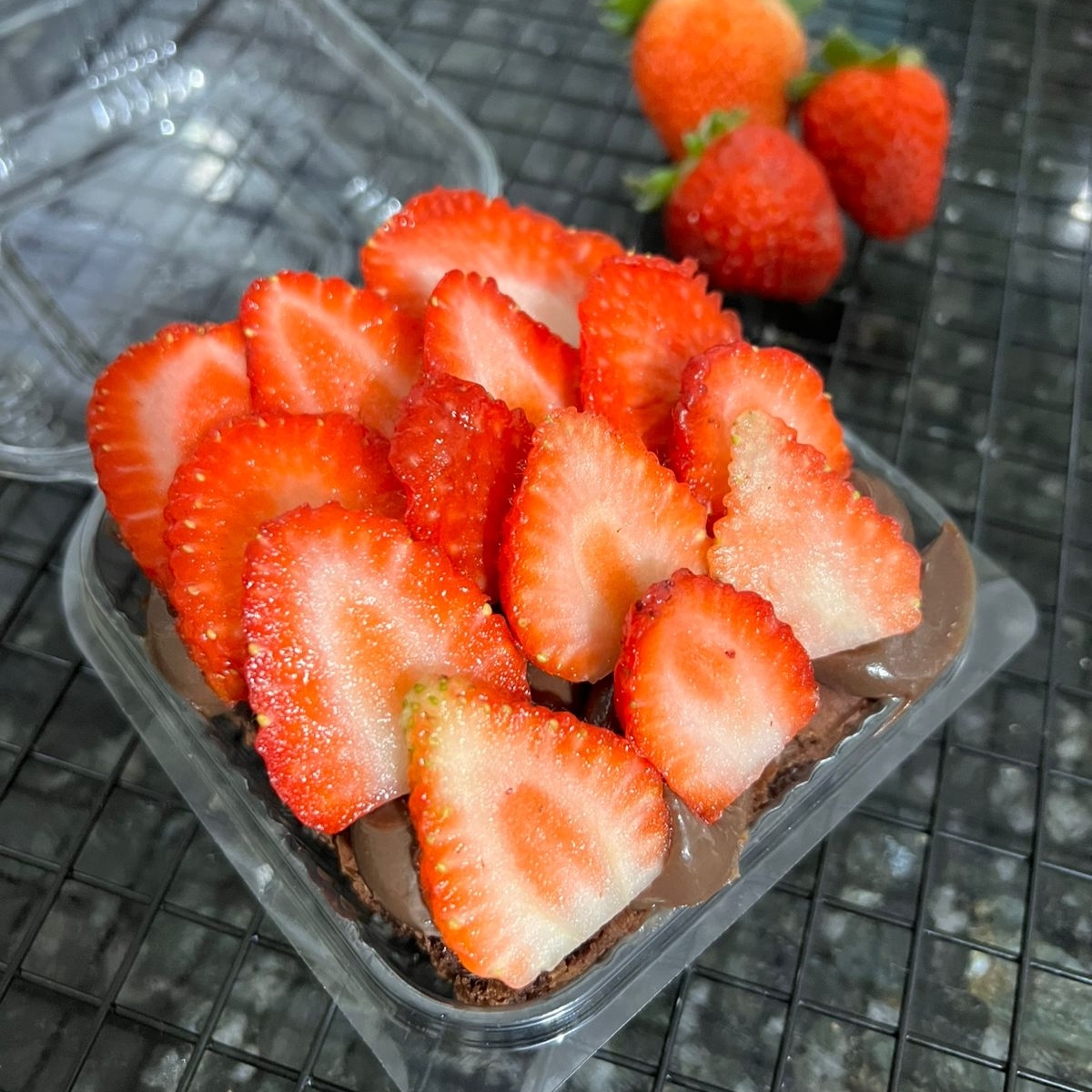 brownie chocolatudo, intenso, com cobertura de brigadeiro tradicional e muitos morangos por cima