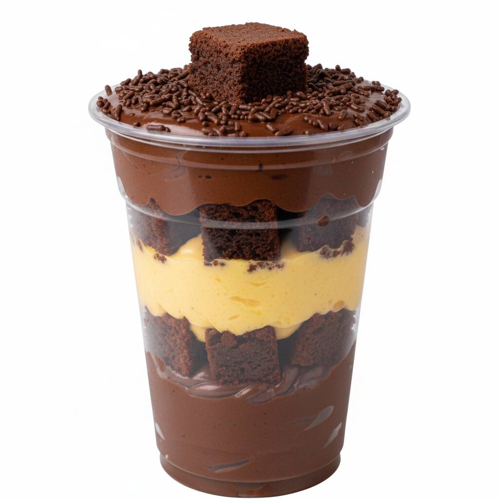 pote com camada de ninho, pedaços de brownie intensos, e outra camada de ninho, uma mistura de sabores.