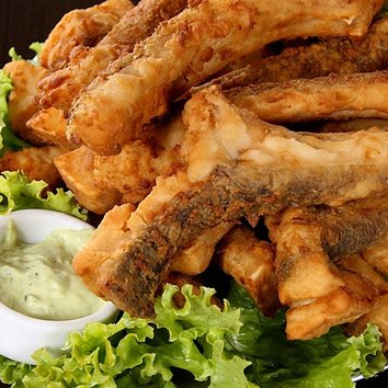 Porção de iscas de peixe empanadas, 400 gramas acompanhada com molho verde!