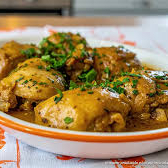 Deliciosa marmita de pintando ao molho com arroz e batata frita.