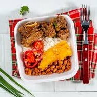 Marmita com costela de vaca cozinhada lentamente, servida com arroz, mandioca, feijão macarrão, banana frita e uma deliciosa salada de repolho e tomate. Uma opção saborosa e nutritiva!